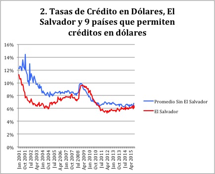 Pero hay otra cosa que es absurda: creer que, en general, los países no dolarizados tienen la ventaja para ajustarse a choques causados por decisiones de la Fed. La idea es que los países no-dolarizados pueden bajar sus tasas de interés por debajo de los niveles en dólares porque tienen su propia moneda. La gráfica 1, que compara las tasas de interés de créditos en toda Latinoamérica, muestra lo absurdo de esta afirmación: es como decir que en una carrera una persona con muletas tiene la ventaja sobre uno que no las necesita porque la primera puede botarlas mientras que el segundo no, porque no tiene. Si fuera cierto que los países no dolarizados pueden bajar las tasas de interés, ¿por qué no las bajan a los niveles de los dolarizados? Sin muletas, sin políticas monetarias, los países dolarizados tienen tasas de interés mucho más bajas que las de los no dolarizados (menos de la mitad que el promedio de los no dolarizados).