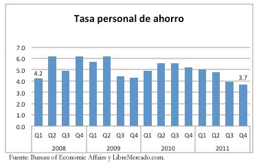 La evolución de la tasa personal de ahorro estadounidense (el ahorro como proporción de la renta disponible personal) muestra una caída de este indicador constante desde mitad de 2010.