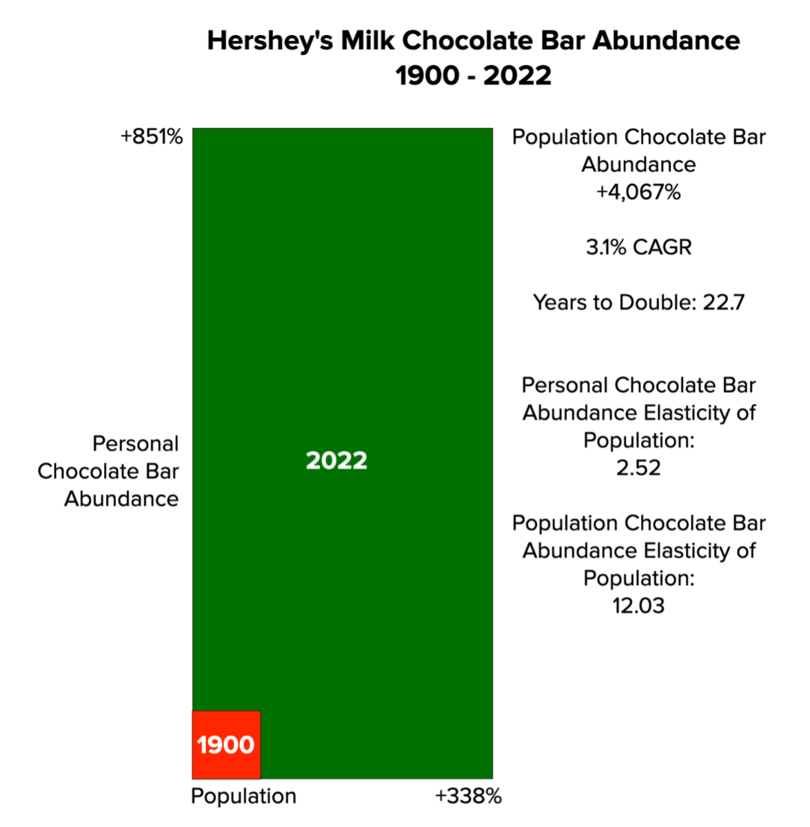 La abundancia a nivel de población es igual a la abundancia personal multiplicada por el tamaño de la población. Entre 1900 y 2022, la abundancia personal de barras de chocolate aumentó en un factor de 9,51 (u 851%), mientras que la población aumentó en un factor de 4,38 (o 338%). Eso indica que la abundancia de barras de chocolate a nivel de la población en EE.UU. aumentó en un factor de 41,67 (o 4.067%). La abundancia de barras de chocolate a nivel de población creció a una tasa de crecimiento anual compuesta (CAGR) de 3,1%, duplicándose en abundancia cada 22,7 años.