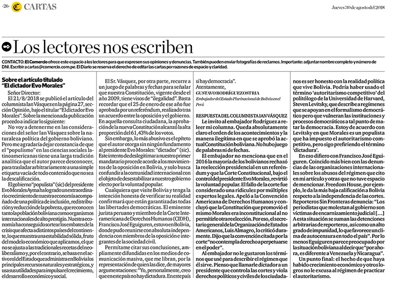 El otro día publiqué un artículo en El Comercio (Perú) titulado "El dictador Evo Morales". Aquí la reacción del embajador de Bolivia en el Perú y mi respuesta: