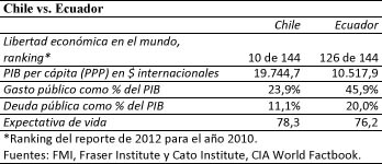 Chile y Ecuador proveen un experimento casi perfecto para comparar visiones económicas rivales. En 1980, Ecuador tenía un ingreso per cápita ligeramente superior que el de Chile. Durante los últimos 33 años, Ecuador ha más que triplicado su ingreso per cápita, pero durante el mismo periodo Chile aumentó su ingreso per cápita por un factor de más de 6. Chile ahora tiene el ingreso per cápita más alto de Sudamérica y la gran mayoría de sus ciudadanos ahora disfrutan de un estilo de vida de clase media. ¿Por qué a Chile ha prosperado mucho más que Ecuador?