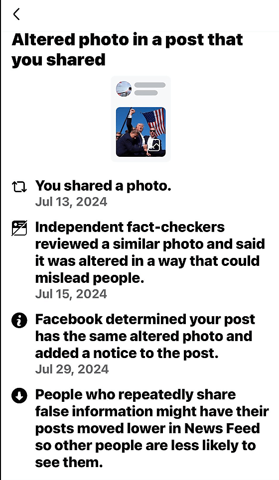 Pero los errores ocurren, como se ha visto en otro caso reciente de aparente parcialidad en el que Meta empezó a etiquetar y degradar la famosa foto de Donald Trump alzando su puño tras el intento de asesinato como desinformación. Se trataba de un error, ya que el programa de comprobación de hechos de Meta había identificado una versión alterada de la foto en la que los agentes del Servicio Secreto habían sido retocados para que pareciera que sonreían. La comprobación de hechos debería haberse aplicado sólo a esa foto retocada, pero los sistemas automatizados de comprobación de hechos aplicaron accidentalmente también a la foto original y real. Pero el momento no podía ser peor, ya que los usuarios ya estaban buscando casos de sesgo tecnológico.