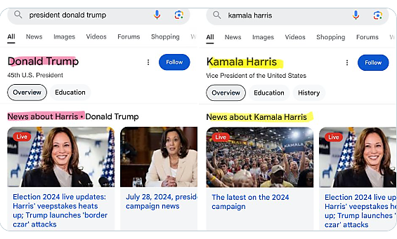 Cuando los usuarios buscaban Donald Trump, Google no ofrecía noticias normales sobre Trump. En su lugar, Google parecía alterar la búsqueda para buscar y mostrar noticias sobre Kamala Harris y Trump. Sin embargo, al buscar Kamala Harris, aparecían resultados de búsqueda normales centrados únicamente en noticias sobre Harris.