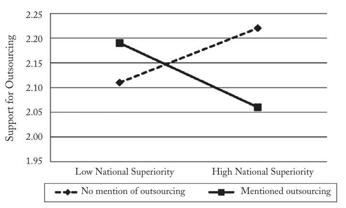 Fuente: Edward D. Mansfield y Diana C. Mutz, "US Versus Them: Mass Attitudes Toward Offshore Outsourcing", World Politics 65, n.º 4 (2013): 601. La percepción de superioridad nacional reduce el apoyo al outsourcing cuando esta práctica económica se denomina explícitamente "outsourcing". Esta es la línea "Outsourcing mencionado". Cuando la misma práctica económica se describe sin utilizar ese término específico, no se produce el mismo patrón. Esta es la línea "Sin mención del outsourcing".