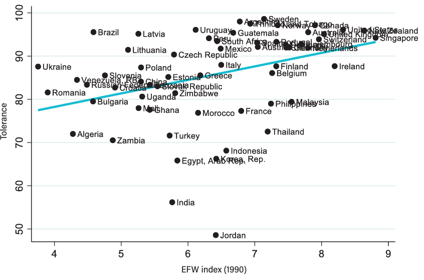 Varios estudios de los economistas Niclas Berggren y Therese Nilsson investigaron la relación entre la tolerancia, la libertad económica y la globalización. Las pruebas que recopilaron sugieren una relación causal entre el nivel de globalización económica y la disposición de los padres a enseñar tolerancia a sus hijos. Otro análisis reveló que la libertad económica desempeña un papel aparentemente causal en que los padres enseñen a sus hijos la tolerancia y fomenten la tolerancia hacia los homosexuales y las personas de diferentes razas (véase Gráfico 3). Centrándose exclusivamente en Estados Unidos, Berggren y Nilsson encontraron una causalidad similar: la libertad económica aumenta la tolerancia hacia los homosexuales, los ateos y los comunistas. Otro estudio reveló que la libertad económica aumenta la tolerancia hacia los homosexuales, especialmente en sociedades con un alto nivel de confianza.