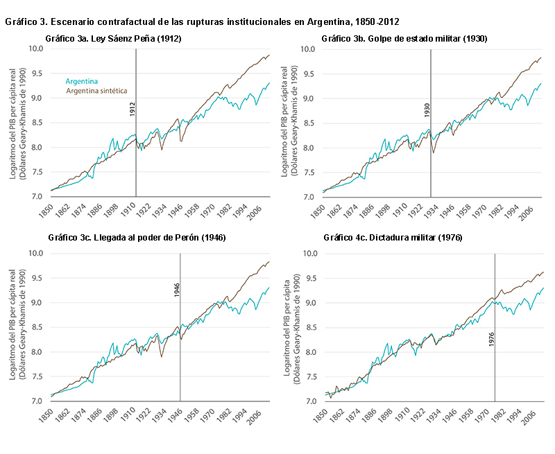 El Gráfico 3 presenta un escenario contrafactual en el desarrollo a largo plazo de Argentina en ausencia de cuatro colapsos institucionales significativos. La evidencia sugiere claramente que los colapsos institucionales restringieron de manera importante el desarrollo a largo plazo de Argentina. Sorprendentemente, la Ley Sáenz Peña de 1912 y el golpe de Estado de 1930 muestran un crecimiento contrafactual y un patrón de desarrollo similares, aunque la primera representó una transición hacia los pesos y contrapesos, mientras que el segundo representó del Estado de Derecho. La Argentina anterior a la Ley Sáenz Peña comparte el crecimiento y las características de desarrollo de Chile (50 por ciento), Alemania (22 por ciento), EE.UU. (21 por ciento), y Uruguay (6 por ciento). De una manera similar, si Perón no hubiese llegado al poder, la Argentina de la posguerra habría seguido el crecimiento y patrón de desarrollo de otros países en la zona templada (Chile y Uruguay), de países de Europa occidental como Suiza y Suecia, y de EE.UU. La ausencia de la dictadura militar y la dependencia en tendencias pre-dictadura está asociada con el costo más generalizado para el desarrollo a largo plazo de los colapsos. En 2010, el PIB real per cápita de Argentina fue de 10.990 dólares internacionales Geary-Khamis (G-K). De no haberse dado el golpe de Estado de 1930, el PIB per cápita hubiera crecido hasta 18.564 dólares internacionales G-K, mientras que un nivel similar hubiera sido alcanzado en la ausencia de la Ley Sáenz Peña, asumiendo que Argentina hubiese continuado sus tendencias preexistentes. En términos per cápita, el golpe de Estado de 1930 está asociado con una diferencia del 68% entre la Argentina contrafactual y la real en 2012, lo que indica un costo a largo plazo sustancial e importante de los colapsos institucionales.