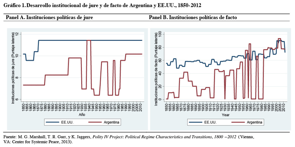 Los patrones de desarrollo institucional entre EE.UU. y Argentina indican la existencia de una amplia brecha que persiste a través del tiempo. La característica más impactante del desarrollo institucional argentino es la persistencia de colapsos tales como oscilaciones entre la democracia y la dictadura, las cuales eran frecuentes y en su mayoría violentas. Comparado con EE.UU., el marco institucional argentino en la década de 1850 se vio afectado por el legado adverso de décadas de guerra civil entre unitarios y federalistas, y por la pesada sombra del colonialismo español. Un contraste marcado con EE.UU. son las restricciones a la participación política por nivel de riqueza y alfabetización que fueron heredadas del periodo de la colonización española persistieron por un largo tiempo.[27] Mientras que las pruebas de alfabetización y otros requisitos arbitrarios de votación arbitrarios desaparecieron en Nueva Inglaterra y los Estados del norte a finales del siglo XIX,[28] Argentina no introdujo el voto secreto y obligatorio para la población adulta hasta 1912.