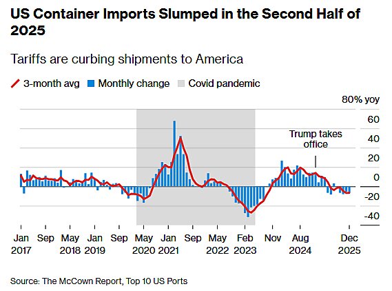 La salida de Estados Unidos del epicentro del comercio mundial comenzó hace años y se ha acelerado en los últimos meses. Según la Organización Mundial del Comercio, la cuota de Estados Unidos en el comercio mundial de mercancías (importaciones más exportaciones) en el tercer trimestre fue la más baja para ese periodo del año desde 2014, y la caída con respecto a 2024 fue mayor que la pérdida acumulada entre 2015 y 2024. Bloomberg News añade que el volumen de contenedores entrantes a través de Norteamérica —de los cuales alrededor del 80% corresponde a Estados Unidos— pasó "de ser líder mundial a quedarse rezagado" el año pasado. Boston Consulting Group prevé que la tendencia continuará en los próximos años, con una caída de la cuota de Estados Unidos en el comercio mundial del 12% en 2024 al 9% en 2034 debido a "las políticas aplicadas por la Administración Trump".