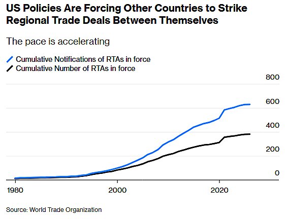 Todos estos acuerdos, junto con las docenas de otros que se han completado desde que Washington ratificó por última vez un nuevo Tratado de Libre Comercio, forman parte de una tendencia más amplia de mayor integración global fuera de Estados Unidos.