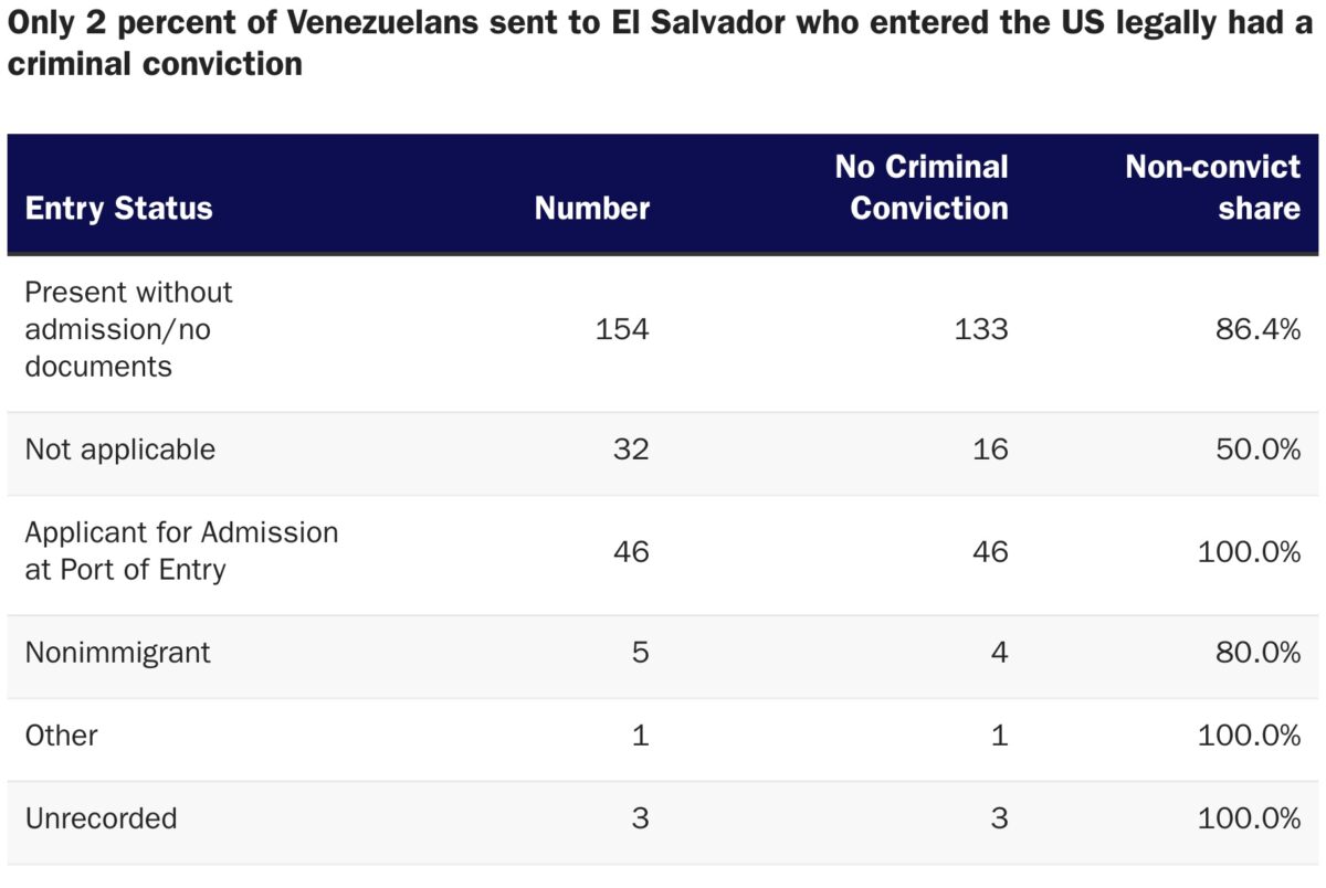 Los datos del DHS también confirman mi informe de mayo, que muestra que más de 50 venezolanos enviados a El Salvador no eran inmigrantes ilegales y entraron en el país legalmente. El DHS incluye a cinco deportados como "no inmigrantes", personas con algún tipo de estatus legal temporal que entraron con un visado. También incluye a 46 como "solicitantes de admisión", término que el DHS utilizó para las personas que entraron legalmente en el país en un puerto de entrada a través del sistema de programación de citas de la aplicación CBP One, bajo la presidencia de Biden. El estatus de entrada de una persona solo se incluyó como "otro". Entre los 51 no inmigrantes y solicitantes de admisión (2%), uno tenía una condena penal. Según ProPublica, Albert Primoschitz González entró legalmente y fue condenado por conducir sin carné válido en 2025.