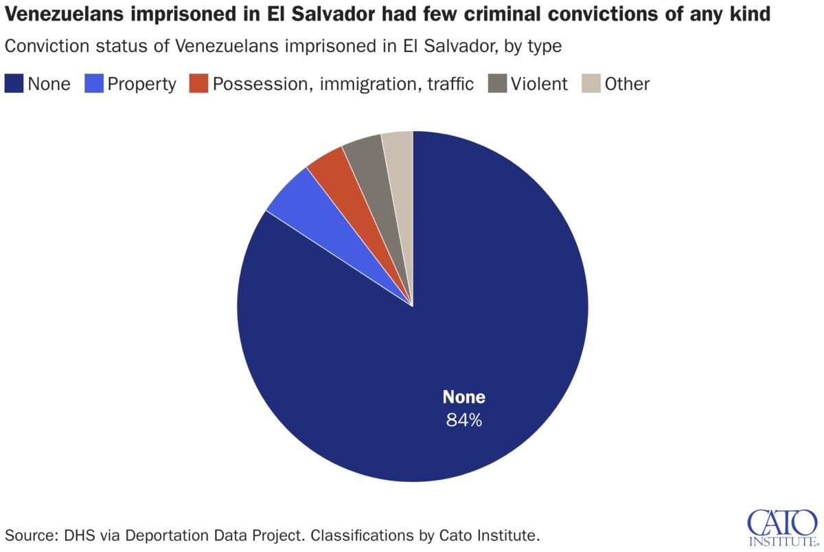 Según los datos del DHS, el 53% de los venezolanos enviados al CECOT no tenían condenas penales ni cargos penales. No se proporcionan detalles sobre los 76 con cargos pendientes, pero muchos cargos se retiran, se desestiman o dan lugar a una absolución. En cualquier caso, encarcelar a alguien por un cargo pendiente pero no probado no satisface en absoluto las preocupaciones sobre el debido proceso.