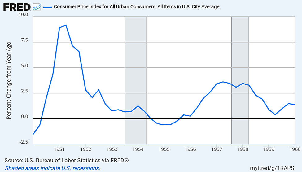 Entre 1952 y 1960, la Fed mantuvo la inflación en una tasa media anual inferior al 2% (véase el gráfico de FRED), y el crecimiento económico real fue de casi un 3% anual de media. Mientras tanto, el Acuerdo entre el Tesoro y la Reserva Federal de 1951 contribuyó a restablecer los rendimientos competitivos en el mercado de valores públicos y permitió a la Fed recuperar su independencia en la fijación de la política monetaria, bajo la supervisión del Congreso. Martin acogió con satisfacción esos cambios.