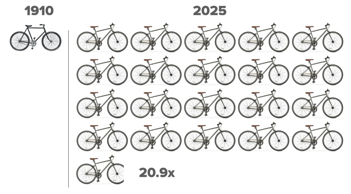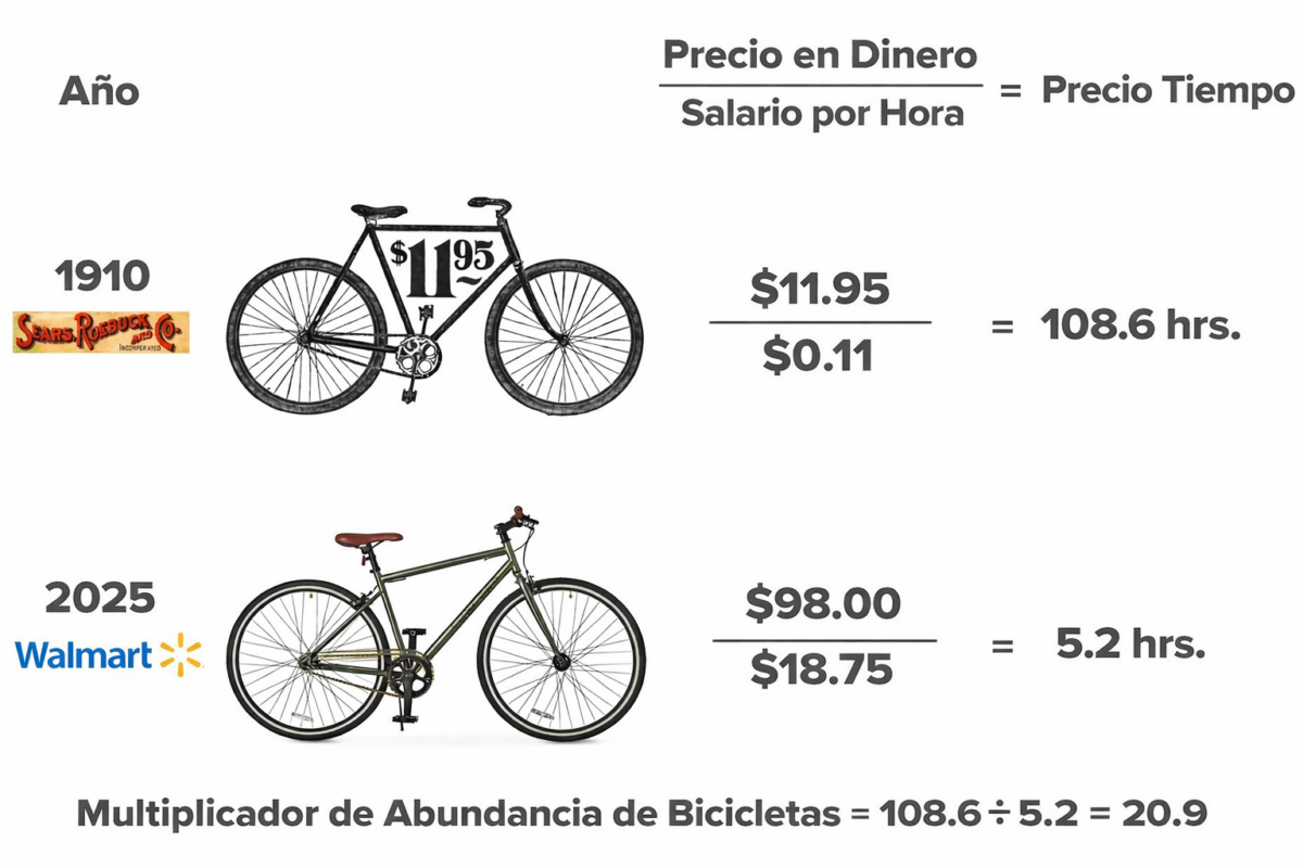 En 1910, se podía comprar una bicicleta básica por 11,95 dólares en el catálogo de Sears, Roebuck and Co. Parece un precio bajo hasta que te das cuenta de que el salario mínimo para los trabajadores no cualificados era de 0,11 dólares la hora. Esto significa que se habrían necesitado 108,6 horas para ganar el dinero necesario para comprar una bicicleta. Hoy en día, se puede comprar una bicicleta básica en Walmart por 98 dólares, y el salario de los trabajadores sin cualificación del sector de la restauración es de 18,75 dólares por hora, lo que supone un precio en tiempo de 5,2 horas. El precio en tiempo ha caído un 95,19%. Por el tiempo necesario para ganar el dinero para comprar una bicicleta en 1910, hoy se pueden comprar 20,9. La abundancia de bicicletas personales ha aumentado un 1.990%.