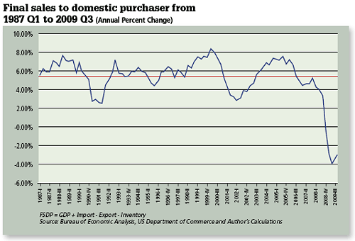 El reclamo de Bernanke fue una gran decepción. La Fed es generador de burbujas en serie. Primero vamos a considerar que la Fed generó burbujas de demanda. La forma más fácil de hacer esto es medir la tendencia de crecimiento de las ventas finales nominales de los compradores estadounidenses y revisar la desviación de esa tendencia. Las ventas finales nominales crecieron a una tasa anual de 5,4 por ciento desde el primer trimestre de 1987 hasta el tercer trimestre del 2009. Esto refleja una combinación de crecimiento real de ventas del 3 por ciento y una inflación de 2,4 por ciento.