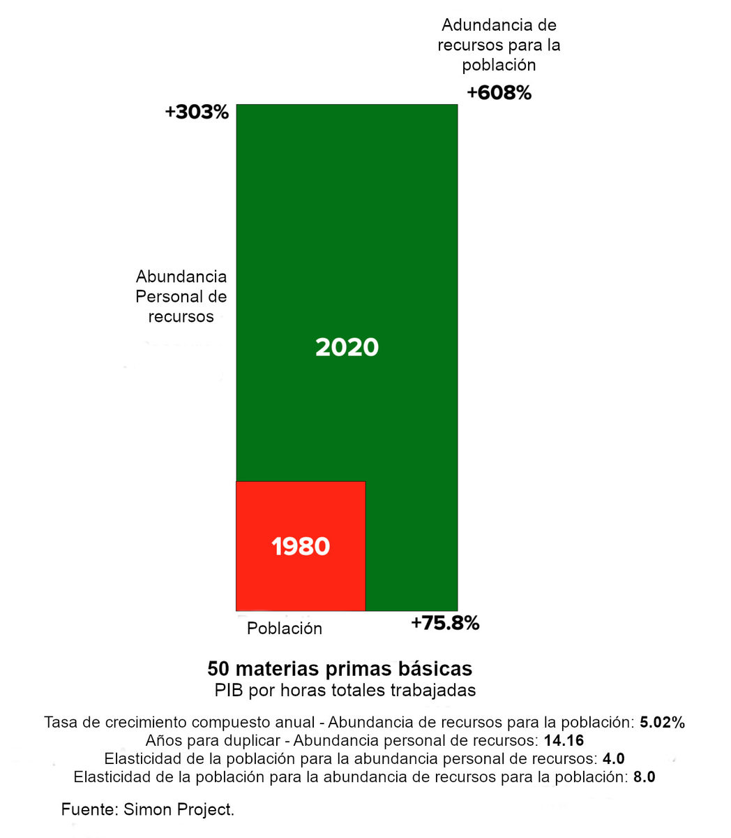 Durante los últimos 40 años, el precio en tiempo promedio de 50 materias primas cayó en 75,2 por ciento, y la población mundial aumentó en 75,8 por ciento. De manera que por cada incremento de uno por ciento en la población mundial, el precio promedio en tiempo de las 50 materias primas cayó por casi uno por ciento (esto es, -75,2 por ciento ÷ 75,8 por ciento = -0,992).
