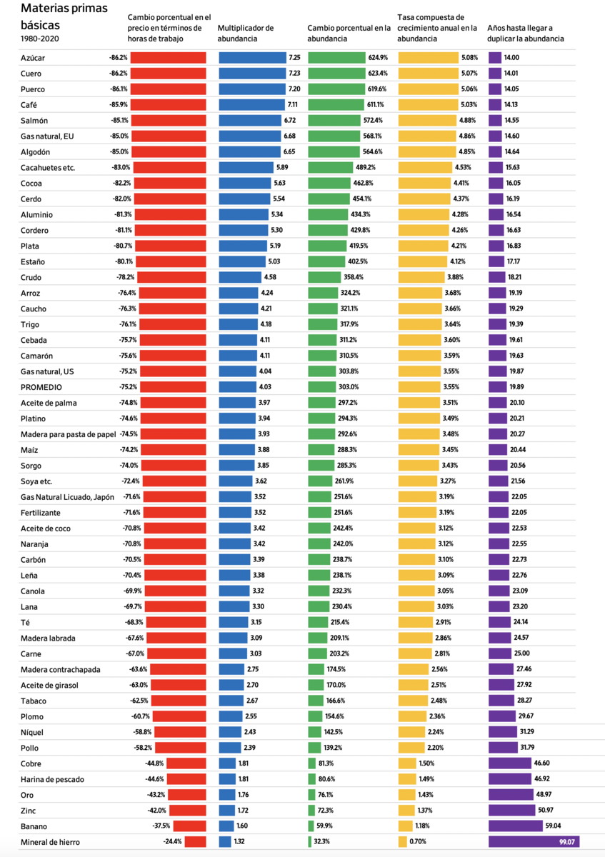 Cuadro 1: Detalle de cambios en los precios en tiempo y en la abundancia de 50 materias primas básicas (entre 1980 y 2020)