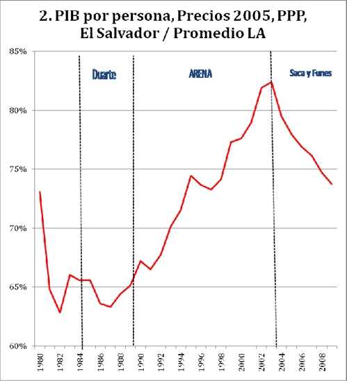 Luego, en los tres períodos de Arena el ingreso por habitante de El Salvador subió mucho más rápido que el del promedio de América Latina, de tal forma que para 2003, el año antes de que entrara el presidente Saca, era el 82 por ciento de este promedio—un aumento de casi veinte puntos. De allí en adelante, en las administraciones de los presidentes Saca y Funes, el país creció mucho menos que el promedio de América Latina, de tal forma que para 2009 ya era sólo 73 por ciento de este promedio—una caída de 9 puntos en seis años. Para el 2009, estábamos igual que lo que habíamos estado en 1980 en relación al promedio de Latinoamérica.