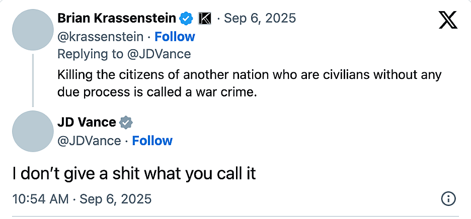 - La última justificación de Rubio es: "Francamente, es una guerra". Pero no es una guerra, e incluso si lo fuera, matar intencionadamente a civiles seguiría siendo un delito. "Lo llamaría crimen de guerra, excepto que aquí no hay guerra", escribe Ilya Somin, de Cato. "Así que, en realidad, es solo un delito común a la antigua usanza". La Constitución reserva los poderes bélicos al Congreso precisamente porque no quería que el presidente tuviera el poder de iniciar guerras por su cuenta y eludir los límites constitucionales del poder. Cuando se le preguntó por la autoridad legal, el vicepresidente JD Vance ni siquiera supo qué responder. Fue más directo cuando se le preguntó si sería un crimen de guerra: