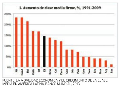 Por otro lado, los datos de la gráfica 1 contradicen la afirmación de que El Salvador es un país en que sólo unos pocos se han beneficiado del progreso desde que terminó la guerra. Al contrario, en las últimas dos décadas nuestra clase media firme ha crecido a tasas que son las sextas más altas en la América Latina. Creció 145 por ciento de 1991 a 2009, más rápido que las clases medias firmes brasileña, colombiana, peruana, guatemalteca, nicaragüense, panameña, uruguaya, venezolana, ecuatoriana, mexicana, argentina y paraguaya.