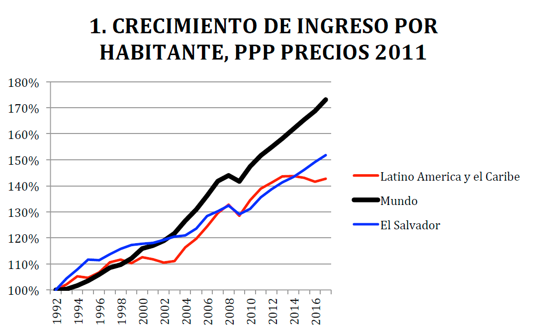 El Salvador no es el país que menos ha crecido en América Latina en los últimos 25 años. En realidad, como se ve en la gráfica 1, ha crecido un poquito más que el promedio de la región. No solo eso. De 2013 a 2017 crecimos a un promedio del 1,80% por año, lo cual es mayor no sólo al promedio latinoamericano sino mayor que Perú (1,72%), Uruguay (1,62%), Guatemala (1,46%), México (1,41%), Chile (0,86%), Ecuador (menos 0,26%), Argentina (menos 0,71%) y Brasil (menos 2,23%).