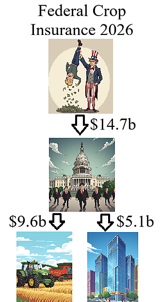 En 2026, se espera que el Gobierno pague a las compañías de seguros 5.100 millones de dólares, incluidos 2.400 millones de dólares en concepto de gastos administrativos y 2.700 millones de dólares en concepto de ganancias por suscripción. La Oficina de Responsabilidad Gubernamental (GAO) constató que las 12 empresas de seguros de cosechas obtienen beneficios muy por encima de las tasas de mercado. Parece muy ineficiente que, para dar a los agricultores una subvención de 9.600 millones de dólares, los contribuyentes también tengan que pagar 5.100 millones de dólares a intermediarios corporativos.