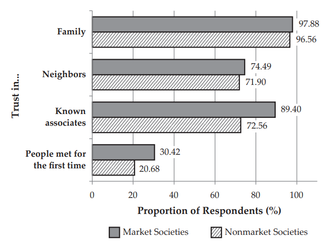 Preparar a las personas para los mercados las hace más optimistas sobre la honradez de desconocidos anónimos y, por lo tanto, aumenta las decisiones de confianza y, a su vez, la eficiencia social. . . . Sin mercados, las interacciones económicas con desconocidos tienden a ser negativas. La proliferación de los mercados permite que sucedan cosas buenas al interactuar con desconocidos, lo que fomenta el optimismo y conduce a comportamientos más confiados. La participación en los mercados, en lugar de hacer que las personas desconfíen, las hace más propensas a confiar en desconocidos anónimos. Por lo tanto, nuestros resultados parecen corroborar la idea del doux commerce. [Cursiva en el original].