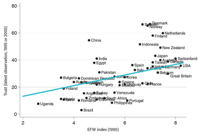 Otros datos de encuestas respaldan las conclusiones de Storr y Choi y sugieren que las sociedades comerciales generan confianza. Utilizando datos del índice de Libertad Económica del Mundo (EFW) y de la Encuesta Mundial de Valores, los investigadores realizaron regresiones entre países con más de 50 países para los años 1995 y 2000. Descubrieron que la libertad económica desempeña un papel significativo y posiblemente causal en el desarrollo de la confianza dentro de los países. Incluso después de controlar variables como la población urbana, la edad, el capital humano, la participación del gobierno en el producto interior bruto, las instituciones políticas y la desigualdad, se ha demostrado que los países con mayores niveles de libertad económica tienen una confianza generalizada más alta que los países menos libres. ¡Pero estos niveles de confianza no son fijos! Los países que experimentan reformas favorables al mercado también ven mejoras en la confianza.