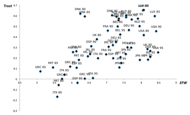 Basándose en datos de encuestas europeas y en el índice EFW, el economista de la Universidad Mercer Antonio Saravia analizó los efectos de la libertad económica en la confianza generalizada durante los años 1980, 1985, 1990 y 1995. Tras aplicar varios controles, Saravia descubrió que un aumento del 10% en la libertad económica daba lugar a un aumento del 2,5% en la confianza generalizada.