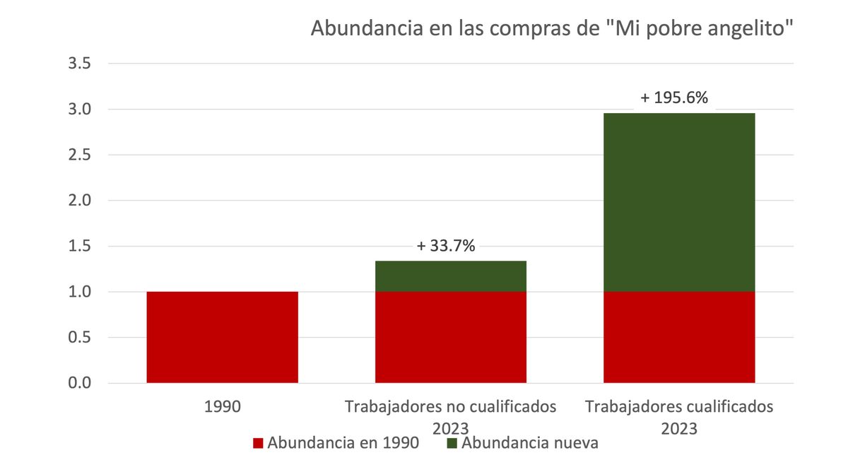 Porque los salarios suelen aumentar más deprisa que los precios. En los últimos 33 años, los salarios por hora no cualificados han aumentado un 178,3%, pasando de 6,03 dólares por hora a unos 16,50 dólares. Esto significa que el precio por hora de la canasta de la compra de Kevin ha bajado un 25,2%. Por el tiempo que tardó en ganar el dinero para comprar la cesta en 1990, hoy obtiene 1,337 canastas. La abundancia de las compras de supermercado ha aumentado un 33,7 por ciento.