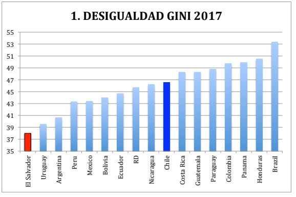Como todos los salvadoreños tienen una marcada tendencia a creer que El Salvador es el peor país del mundo en todo, una actitud que ha sido reforzada por décadas de propaganda del FMLN y acompañantes, aquí se asume que nuestro país tiene la peor distribución del ingreso del mundo —es decir, que aquí es donde se observan las mayores diferencias entre los pobres y los ricos, no solo en una localidad específica, sino en general. Para toda esta gente será una sorpresa ver la gráfica 1, que muestra, para toda Latinoamérica, el índice de Gini, que mide la desigualdad en una sociedad.