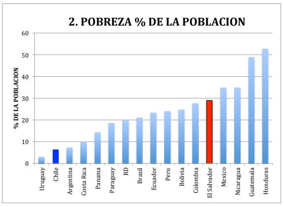 Al ver la gráfica nadie debe de caer en la trampa de pensar que ésta mide la pobreza. Desigualdad y pobreza no son lo mismo. Un país puede ser menos igualitario que otro pero tener menos pobreza. Por ejemplo, como se ve al comparar las gráficas 1 y 2, Chile es mucho más desigual que El Salvador, pero tiene mucho menos pobreza (el 6,4% de la población contra 29% en El Salvador) porque su ingreso por habitante es muchísimo más alto. El pastel se distribuye menos igualitariamente en Chile, pero, como el pastel es más grande relativo a la población, los pedazos que recibe la gente son más grandes.