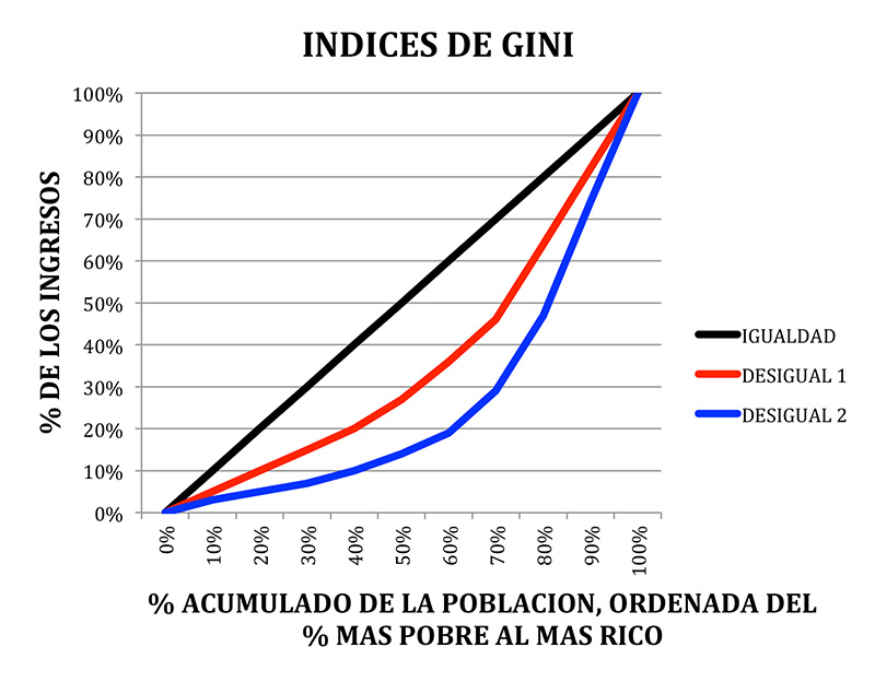 En el ejemplo, el área de esa media luna es el 26% del área debajo de la recta negra. Es decir, el índice Gini es de 26. El índice Gini de la curva azul es de 44. Como se puede ver, cuando una sociedad es más desigual su índice de Gini aumenta porque el área de la media luna que lo separa de la igualdad perfecta aumenta.