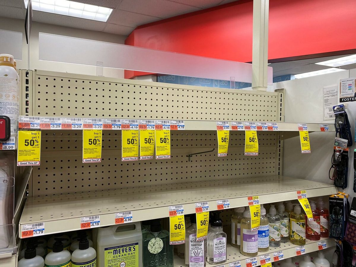 Quizás como resultado de la amenaza de acción estatal, o por preocupaciones acerca de un rechazo por parte de los consumidores, muchas empresas en EE.UU. han mantenido los precios bajos, algunos incluso vendiendo con descuento el anti-bacterial frente a la demanda creciente. Los resultados son claros, estando muchas perchas vacías (ver imagen abajo). He escuchado historias de la ciudad de Nueva York donde las farmacias tienen un stock de mercado negro tras bastidores.