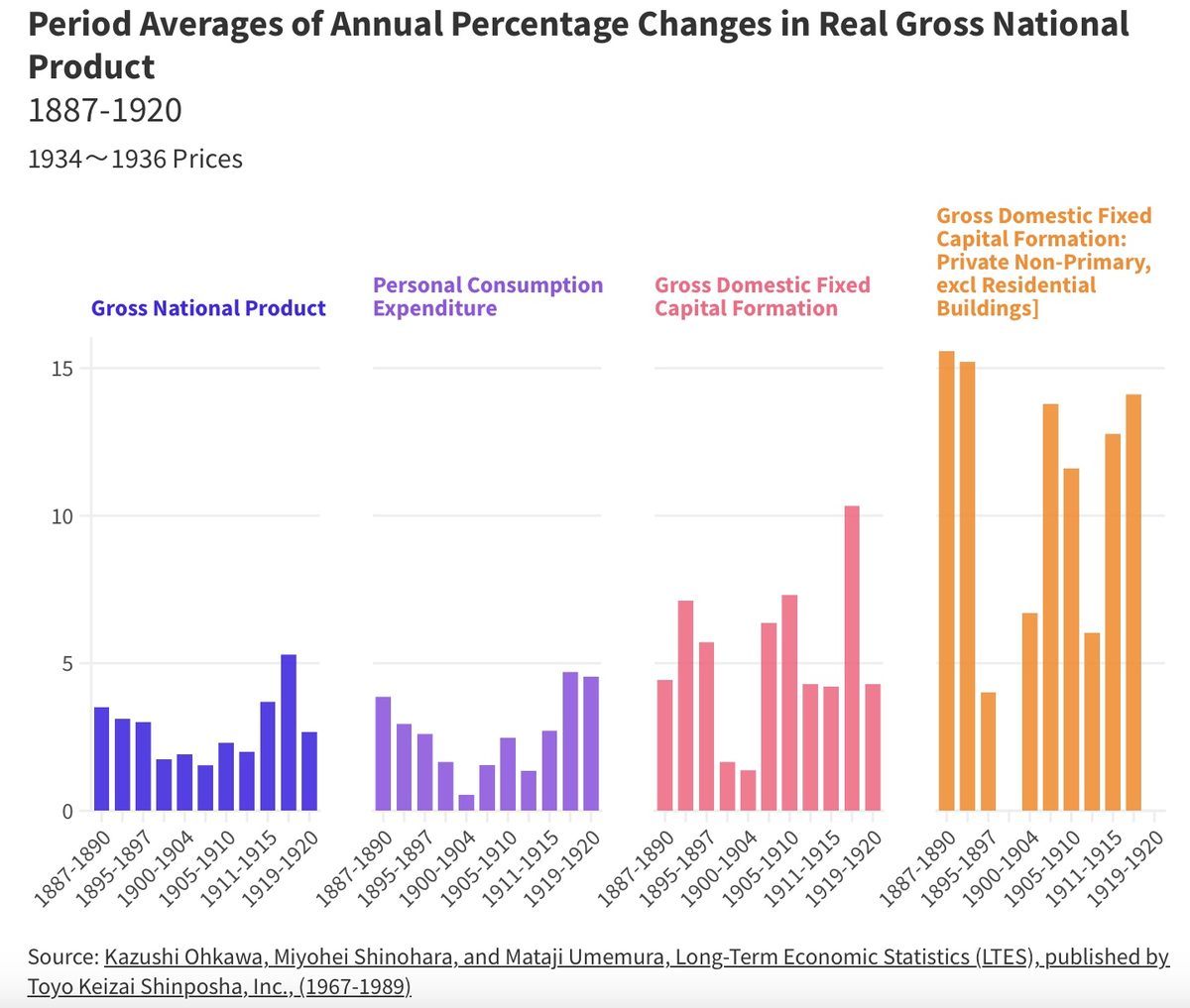 El desarrollo de innovaciones tecnológicas mejoró la industria japonesa. Ryoshin Minami demostró que el crecimiento de la potencia total entre 1891 y 1937 fue del orden del 13% anual. La siguiente figura muestra la tasa de crecimiento del desarrollo de las industrias primarias durante el periodo comprendido entre 1887 y 1920, así como el crecimiento económico general. En muchos de los años de ese periodo, el crecimiento del capital fijo privado no primario fue de dos dígitos.
