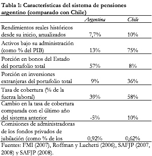Sin embargo, Argentina claramente no había podido repetir el éxito de Chile. Los rendimientos siempre habían estado sujetos a una inmensa volatilidad (Auguste y Artana, 2006, p. 36; SAFJP, 2008, p. 6) y experimentaron cuantiosas pérdidas hacia el final. La diversificación en los portafolios de las AFJPs permaneció pobre a pesar de mejoras, con una fuerte concentración en deuda del Estado y poca inversión en el extranjero. Las tasas de cobertura incluso habían disminuido comparadas con las del sistema anterior. Los fondos de pensiones continuaron siendo comparativamente caros para los clientes. La Tabla 1 resume las características principales del sistema.