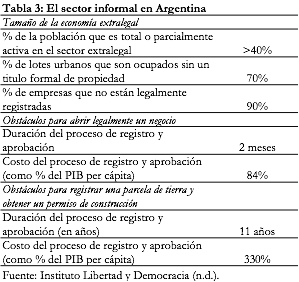 El problema con este argumento es que asume que la gente deliberadamente elige trabajar en el sector informal, y que los incentivos mejorados tales como impuestos más bajos sobre el empleo forma podrían cambiarles su manera de pensar. Esta es una presunción razonable en países en los que es fácil ingresar al sector formal de la economía pero con una carga tributaria excesivamente pesada. También podría aplicarse a ciertos sectores de la fuerza laboral argentina. Pero, como de Soto (2000) ha demostrado, en países en los que la economía extralegal no es la excepción sino más bien la norma, es irracional presumir que la gente elige voluntariamente esta manera de hacer negocios. Un equipo de trabajo del Instituto Libertad y Democracia de de Soto ha examinado el sector informal de Argentina. Sus principales descubrimientos, mostrados en la Tabla 3, indican que para grandes sectores de la población es simplemente imposible la participación en actividades económicas basadas en derechos de propiedad registrados, contratos ejecutables y transacciones legalmente protegidas. El costo de acceso es prohibitivamente alto.