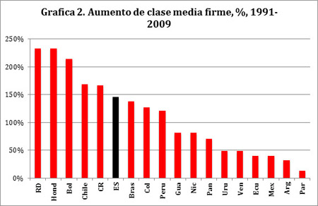 Contradiciendo más al FMLN, El Salvador se encuentra entre los países en los que la clase media firme ha crecido más en el largo plazo como porcentaje de la población. Como se ve en la gráfica 2, ocupamos el lugar 6 entre 18 países en términos de crecimiento de esa clase media firme, que creció 145 por ciento de 1991 a 2009, más rápido que la brasileña, colombiana, peruana, guatemalteca, nicaragüense, panameña, uruguaya, venezolana, ecuatoriana, mexicana, argentina y paraguaya.
