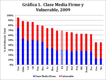 En realidad, El Salvador tiene una clase media que es similar como porcentaje de la población total al promedio de América Latina. En el 2009, nuestra clase media representaba el 69 por ciento de la población. El promedio de todos los países de América Latina representaba un 70 por ciento. Estos datos son de un reciente estudio sobre la movilidad social y la clase media (La movilidad económica y el crecimiento de la clase media en América Latina, Banco Mundial, 2013) que publicó el Banco Mundial. El estudio divide la clase media en dos partes: la clase media firme, que aguanta reveses económicos serios, y la clase media vulnerable, que puede retroceder a la pobreza en casos extremos. Estos dos componentes se muestran en la gráfica 1. En ella se ve que en el total y en ambos componentes estamos muy cerca del promedio de Latinoamérica.