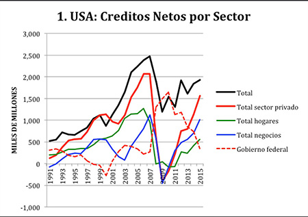 Si usted quiere saber por qué el banco central de EE.UU., la Fed, está pensando en subir los intereses mire la gráfica 1. El crédito al sector privado (hogares más negocios), que había colapsado en 2008, se está recuperando muy rápido, tanto que está alcanzando los niveles que tenía cuando reventó la crisis en 2008. Si sigue creciendo a esa velocidad, va a generar demanda en exceso de lo que puede producir el país, con lo que el exceso se va a tornar o en déficits mayores en la balanza de pagos (importaciones creciendo más rápido que las exportaciones) o en inflación (cuando la demanda sube y la oferta no, suben los precios), o en el crecimiento excesivo de una burbuja de los precios de las acciones y otros activos que luego pueden colapsar (esto puede estar ya sucediendo).