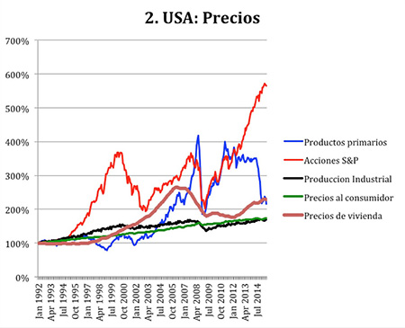 Mire en la gráfica que desde los años noventa ha habido seis burbujas: tres en acciones, dos en productos primarios y una en viviendas. Mientras todas estas burbujas crecían, con sus precios subiendo estratosféricamente por sobre todo lo demás (compare con los precios al consumidor, que miden los precios de todas las cosas en promedio), la producción industrial crecía apenas, mostrando que los aumentos de precios en las burbujas no representaban un aumento en la actividad económica sino solo una salida para los excesos de dinero creado.