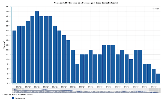 Como muestra el Gráfico 2, la industria manufacturera estadounidense representaba el 11% del PIB antes de que comenzara esta guerra comercial unipersonal en 2018. En el segundo trimestre de 2025, la industria manufacturera se había reducido al 9,4% del PIB.