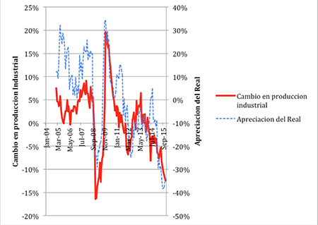 Mire el caso de Brasil, en la gráfica adjunta (la apreciación es la inversa de la devaluación, de modo que la apreciación negativa significa devaluación). Note que la producción industrial ha aumentado cuando la moneda se ha apreciado, y ha disminuido (repito, ha disminuido) cuando la moneda se ha devaluado. Esto está pasando en casi toda América Latina, en Rusia y en otros países emergentes, incluyendo a China, en donde la tasa de crecimiento de la producción está cayendo a pesar de que su moneda se ha devaluado fuertemente. Los políticos como Dilma Rousseff, que creyeron a los economistas, reales o fingidos, que enfocaban sus ojos a las cámaras de televisión y decían con gran seriedad, "si la producción cae, no se preocupe, devalúe, y la producción subirá" ahora se dan cuenta de que se los engancharon con cuentos de camino real. Igual están sintiendo los empresarios que se tragaron estos clichés al hacer sus estrategias corporativas.