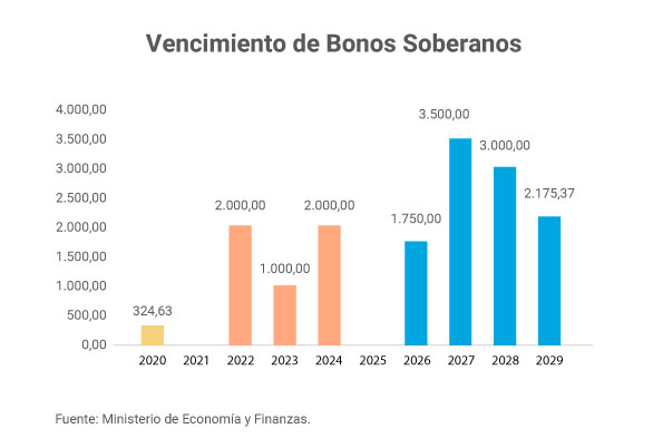 En lo que a bonos respecta, el régimen actual solo deberá pagar $325 millones pendientes de los Bonos 2020. Y aunque en el periodo 2021-2025 se deberán cancelar USD 5.000 millones, la carga más fuerte deberá ser asumida en el periodo 2025-2029, cuando se deben pagar USD 10.425 millones de la deuda. A esto hay que sumarle los vencimientos de las deudas con China de más de USD 5.000 millones.