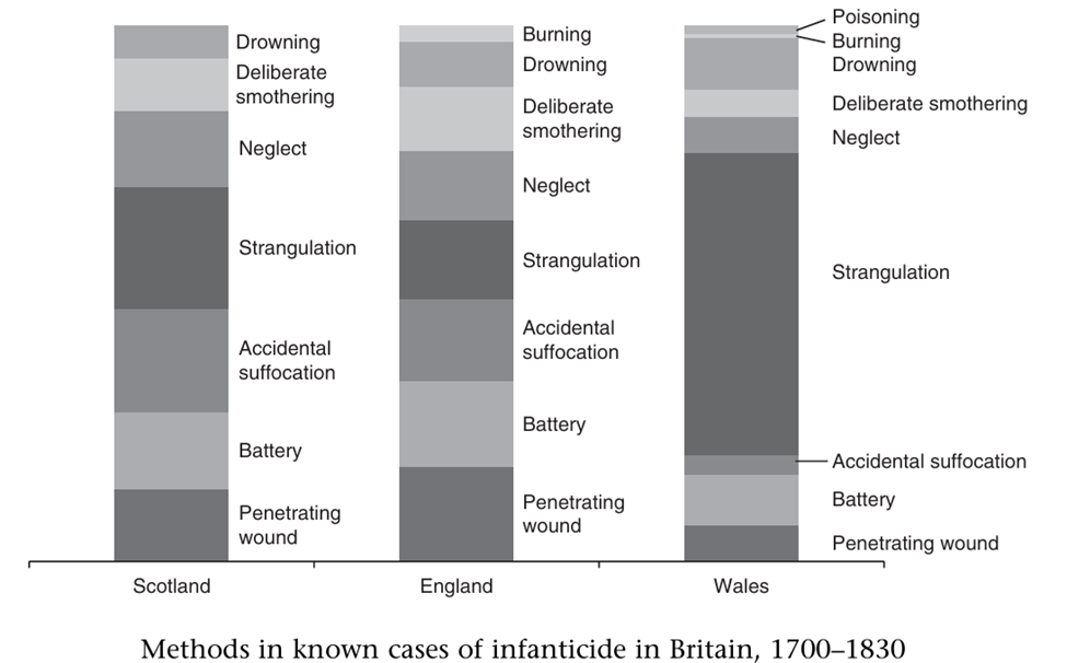 Los bebés también eran arrojados desde ventanas, lanzados por acantilados y golpeados contra objetos inanimados como árboles y el lateral de edificios. A veces se utilizaban en los ataques enseres domésticos comunes o prendas de vestir, como candelabros, hierros, atizadores, hebillas, zapatos y zuecos. Por poner algunos ejemplos más concretos: en la Escocia premoderna, por ejemplo, Marion Dalgleish mató a su hijo recién nacido a puñaladas con unas tijeras cerca de Edimburgo en 1703; la mujer de las Highlands Jean Black mató a su bebé a golpes con una pala en 1747; Helen Munro descuartizó a un neonato con un hacha en 1763. . . . En Inglaterra, durante el largo siglo XVIII, Ann Armor fue acusada de infanticidio por haber fracturado el cráneo de su recién nacido tras arrojarlo a una 'casa de oficio' o letrina donde recibió una contusión mortal en un lado de la cabeza; en 1737, Mary Shrewsbury fue acusada de matar a su hijo mediante un intento de decapitación con un cuchillo; en 1774, Jane Cornforth utilizó un clavo para abrir el estómago de su hijo recién nacido, dejando así al descubierto sus intestinos, lo que le causó la muerte inmediata. . . . En Gales, durante esta época, Mary Robert, de Pembrokeshire, golpeó a su bebé varias veces contra el suelo, lo que le causó la muerte, en 1766; en 1793, una mujer llamada Margaret Evans, de Montgomeryshire, golpeó a su recién nacido con un ladrillo hasta matarlo; en Carmarthenshire, en 1802, Gwenllian Richard apuñaló a su hijo repetidamente en la garganta con un cuchillo".