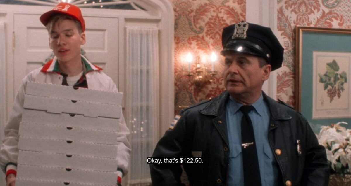 En la película, la familia McCallister también pide 10 pizzas, y la cuenta asciende a 122,50 dólares (más la propina). Eso situaría el precio en tiempo para los trabajadores manuales de la década de 1990 en 11,87 horas, o aproximadamente una hora y 11 minutos por pizza.