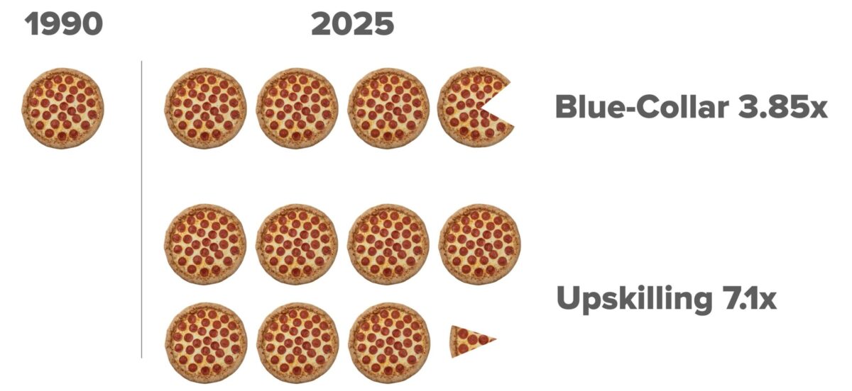 Gale L. Pooley señala que desde 1990, la abundancia de alimentos ha aumentado en un 43,2% y la de pizzas en un 285% para los trabajadores manuales. Si mejorabas tus habilidades, el aumento era del 186% para los alimentos y del 610% para las pizzas.