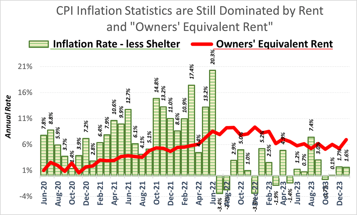 Cuando se publicó el IPC de enero, los periodistas del Wall Street Journal Justin Lahart y Nick Timiraos opinaron que "la inflación volvió a moderarse en enero, pero se situó por encima de las expectativas de Wall Street, enturbiando la senda de recortes de tipos de la Reserva Federal y dando potencialmente un respiro al banco central para esperar hasta mediados de año". Eso implicaba que el Comité Federal de Mercado Abierto podría basar las manipulaciones de los tipos de interés de los próximos meses en el "inesperado" aumento del OER de un mes. También implica que la Reserva Federal imagina de algún modo que mantener el tipo de interés de las reservas bancarias muy por encima de la tasa de inflación no relacionada con la vivienda podría, de algún modo inexplicable, disminuir los futuros aumentos de los alquileres.