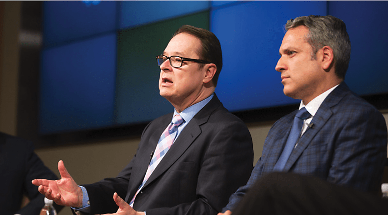 David Boaz (izquierda), antiguo Senior Fellow, habla en un panel con Ian Vásquez (derecha), vicepresidente de estudios internacionales, en un acto de celebración del aniversario No. 40 del Instituto Cato en 2017.