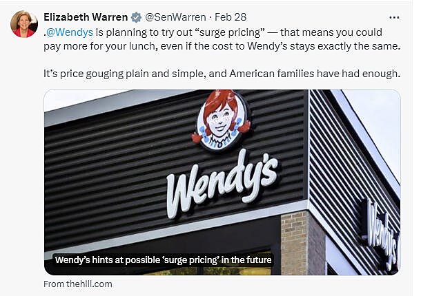 Ahora bien, este principio ya está ampliamente aceptado en varios ámbitos de la vida. Pero, por alguna razón, cada vez que se plantea para un nuevo sector, cunde el pánico. La fijación dinámica de precios parece un concepto especialmente impopular cuando se trata de la venta de alimentos. Y cuando hay preocupación, se puede contar con políticos populistas que se suben al carro. Así, rápidamente, la senadora Elizabeth Warren –que parece tener una opinión sobre la estrategia de precios de todas las empresas– tachó los planes de Wendy's de "precios abusivos" y los describió como un intento codicioso de hacer pagar más por el almuerzo.