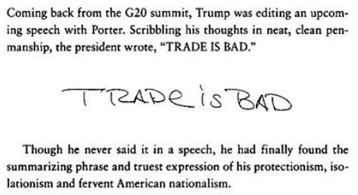 Las opiniones de Trump sobre la inmigración, la sanidad, los impuestos, el intervencionismo extranjero y muchas otras cosas han cambiado desde los años ochenta, pero sus opiniones sobre el comercio nunca han vacilado: es un juego de suma cero; las balanzas comerciales indican quién gana y quién pierde (superávit bueno, déficit malo); los gobiernos extranjeros hacen trampas para ganar; y los aranceles –¡buenos aranceles!– pueden cambiar las tornas a favor de Estados Unidos, impulsando de paso el empleo, las exportaciones y el crecimiento. Lo dijo en aquel anuncio de periódico; lo volvió a decir tres años después en una larga entrevista con (lol) la revista Playboy; y lo ha dicho –en público y en privado– docenas de veces desde entonces, especialmente durante su primer mandato como presidente. Bob Woodward documentó en su libro que Trump llegó incluso a garabatear "EL COMERCIO ES MALO" en los márgenes del borrador de un discurso presidencial: